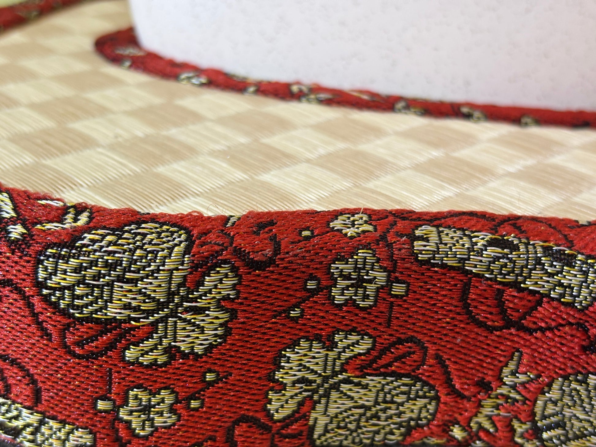 やさしい生成りの市松模様の畳表に、赤地に華やかな文様が織り込まれた縁を組み合わせました。