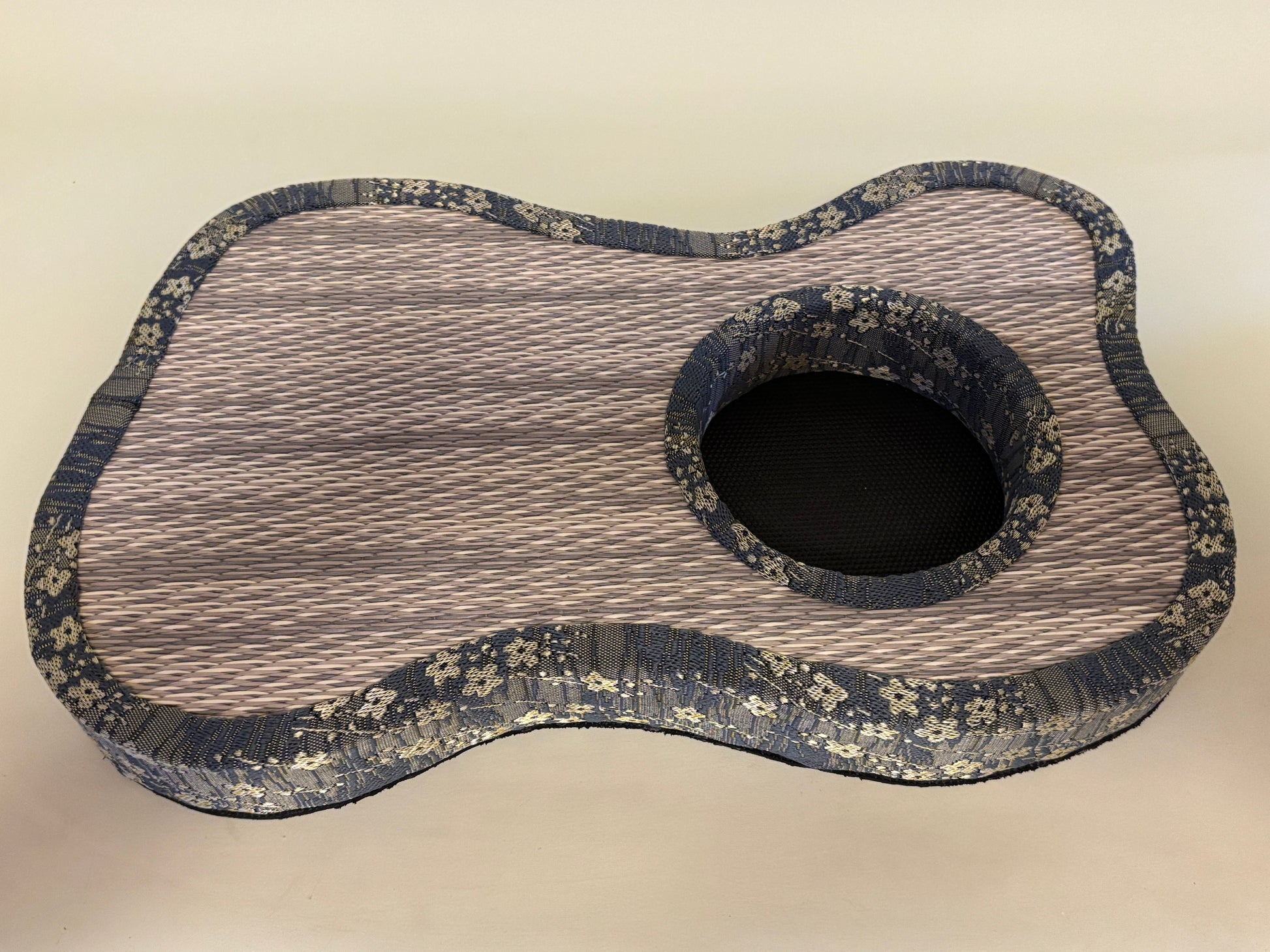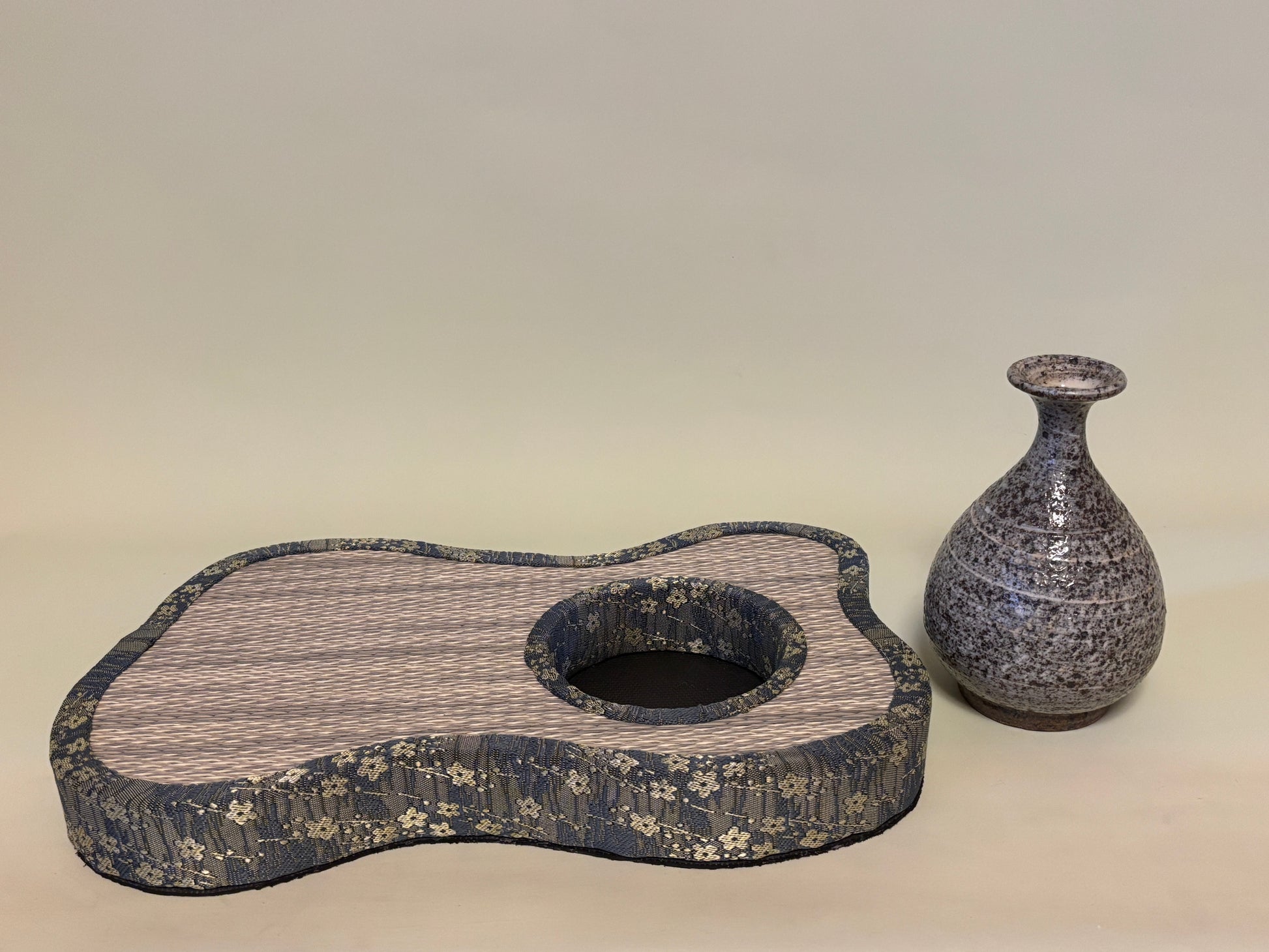 Each one is custom-designed to match the shape and size of a specific vase or water basin, with a hollow space at the center to embed the container seamlessly into the tatami surface.