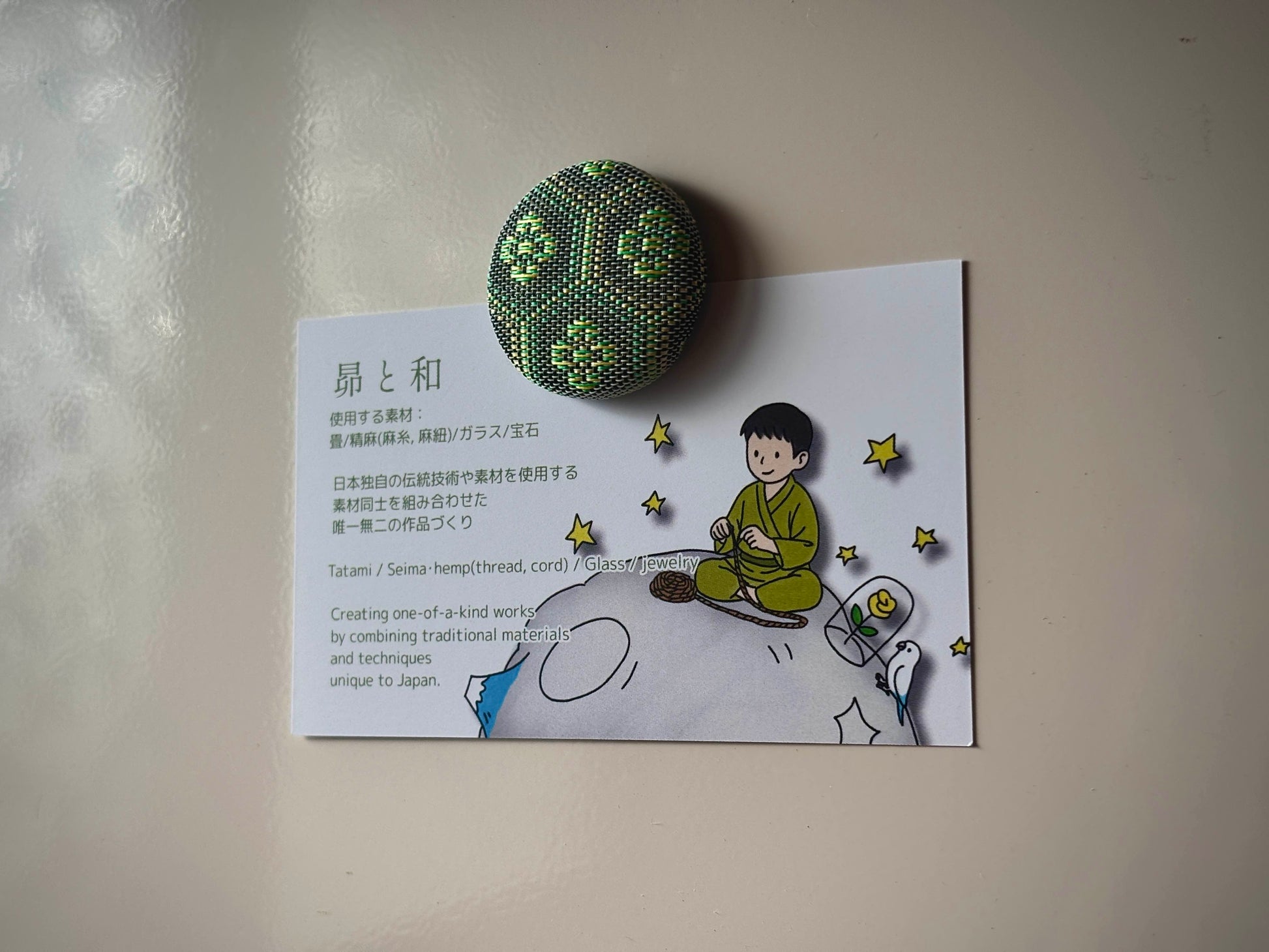 日本の伝統素材「畳縁(たたみべり)」を使って、ひとつひとつ手作業で仕上げたマグネットです。